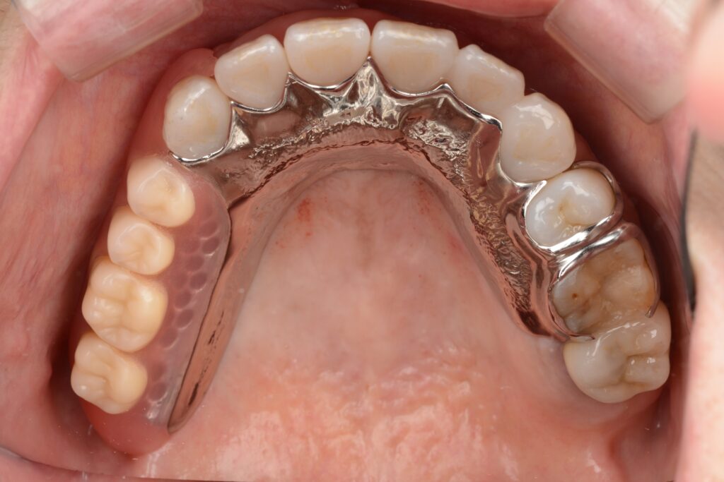 この入れ歯は、見えるところはできるだけ目立たないように、見えないところは強度と違和感の軽減のために金属を使っています。
